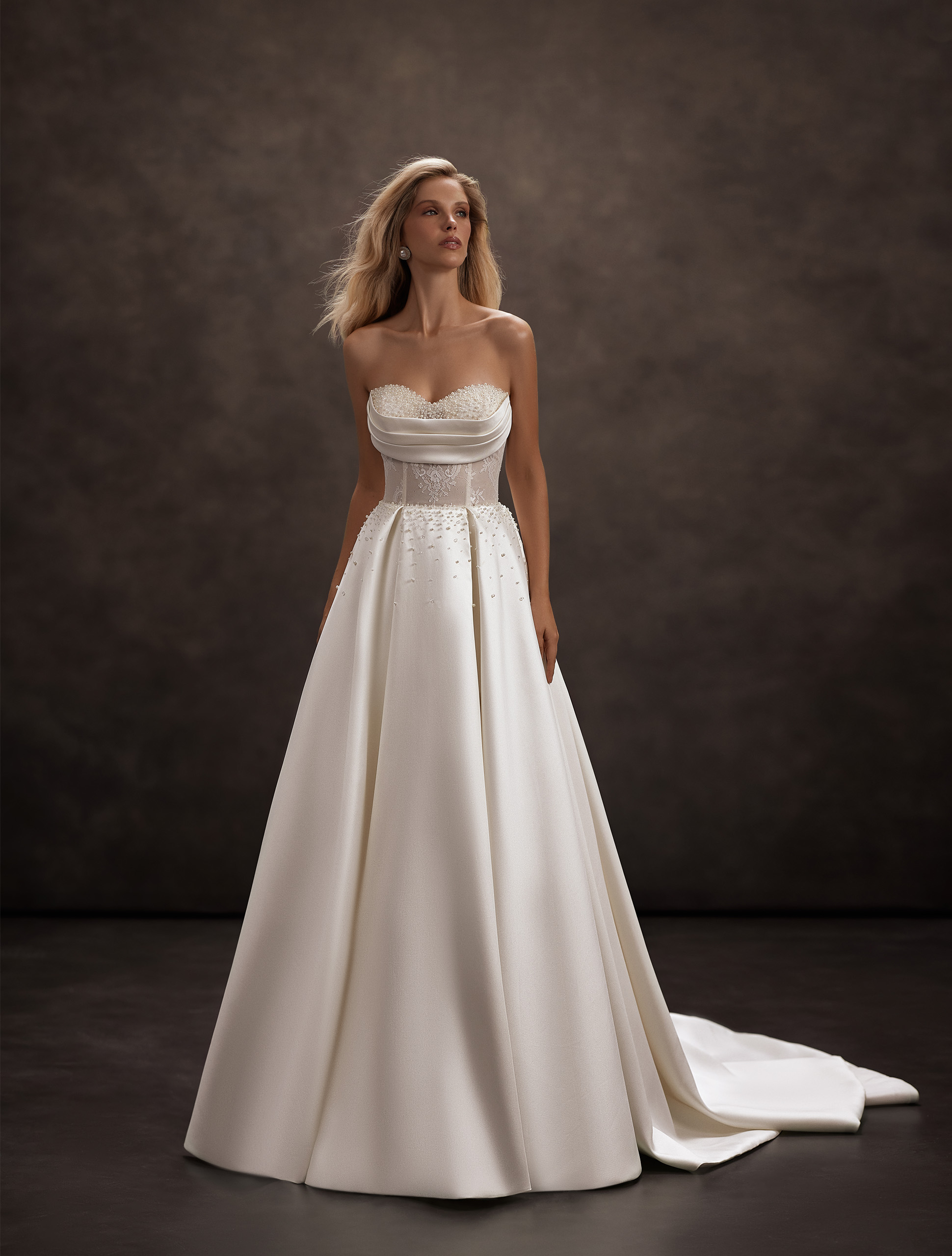 A refined classic A-line gown where charm is born from the harmony of lace and satin. The focal point is the strapless bodice, exquisitely adorned with pearls, beads, and sequins. Delicate draping beautifully highlights the neckline, adding a touch of softness to the look. The luxurious pleated skirt is sprinkled with tiny pearls, beads, and sequins, creating a subtle shimmering effect with every movement. An elegant, timeless look designed to leave a lasting impression.