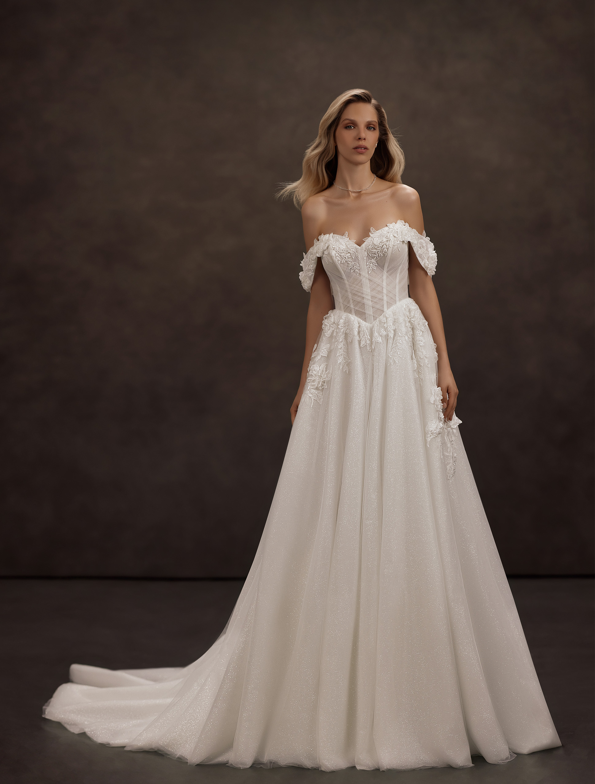 O rochie în siluetă A, parcă creată pentru lejeritate și grație, cu un corsaj în formă V rafinată. Drapajul delicat și bretelele căzute, decorate cu dantelă, conferă ținutei finețe și rafinament feminin. Fusta din glitter sclipitor curge în jocul luminii, iar accentele din dantelă fac silueta magic de aerată și romantică.