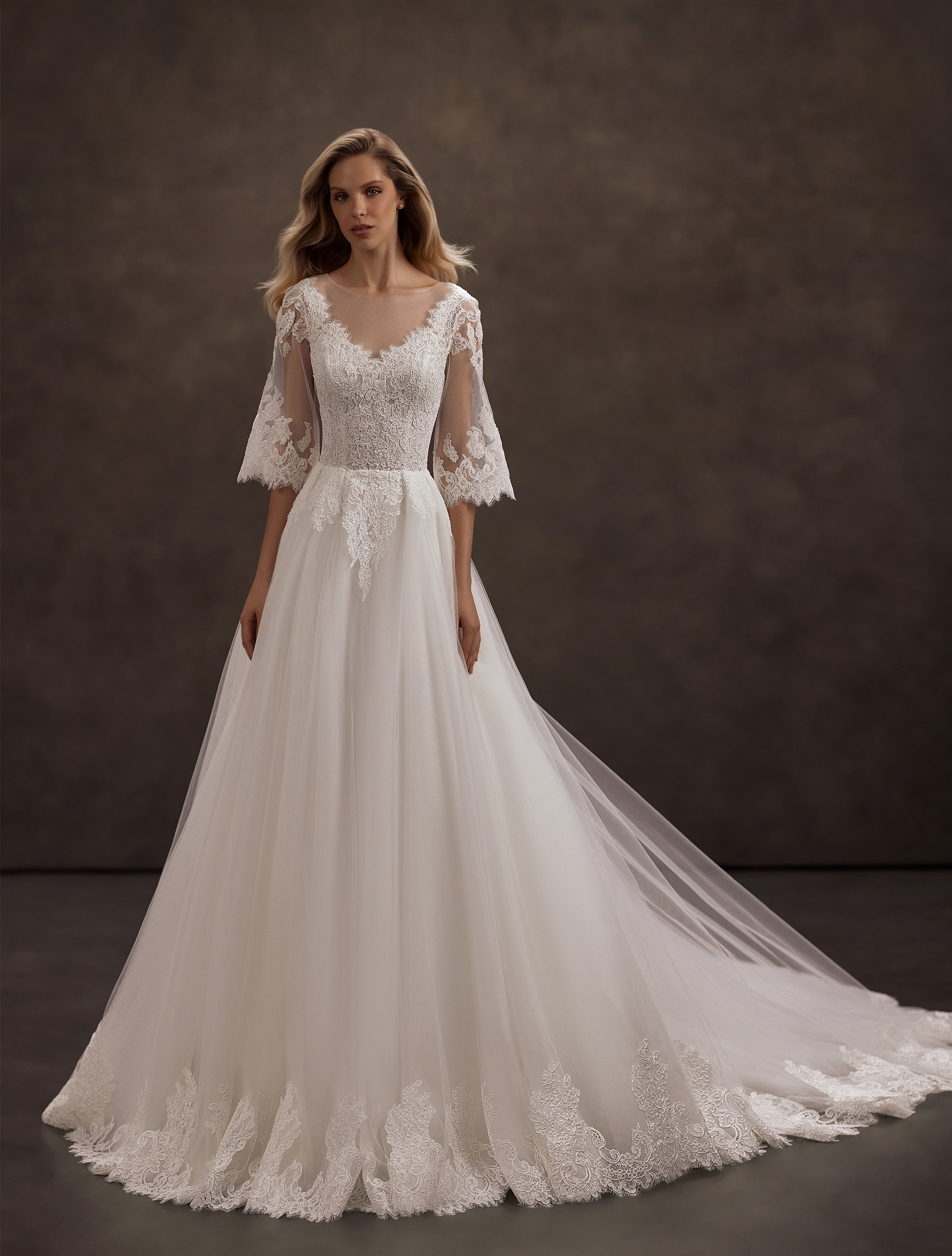 O rochie ușoară și feminină în siluetă A, creată pentru un look rafinat și romantic. Mânecilor lungi, decorate cu dantelă delicată, conferă siluetei o finețe și eleganță nobilă. Fusta aerată din tul, completată cu accente din dantelă, curge la fiecare pas, umplând ținuta cu o senzație de lejeritate, puritate și armonie feminină.