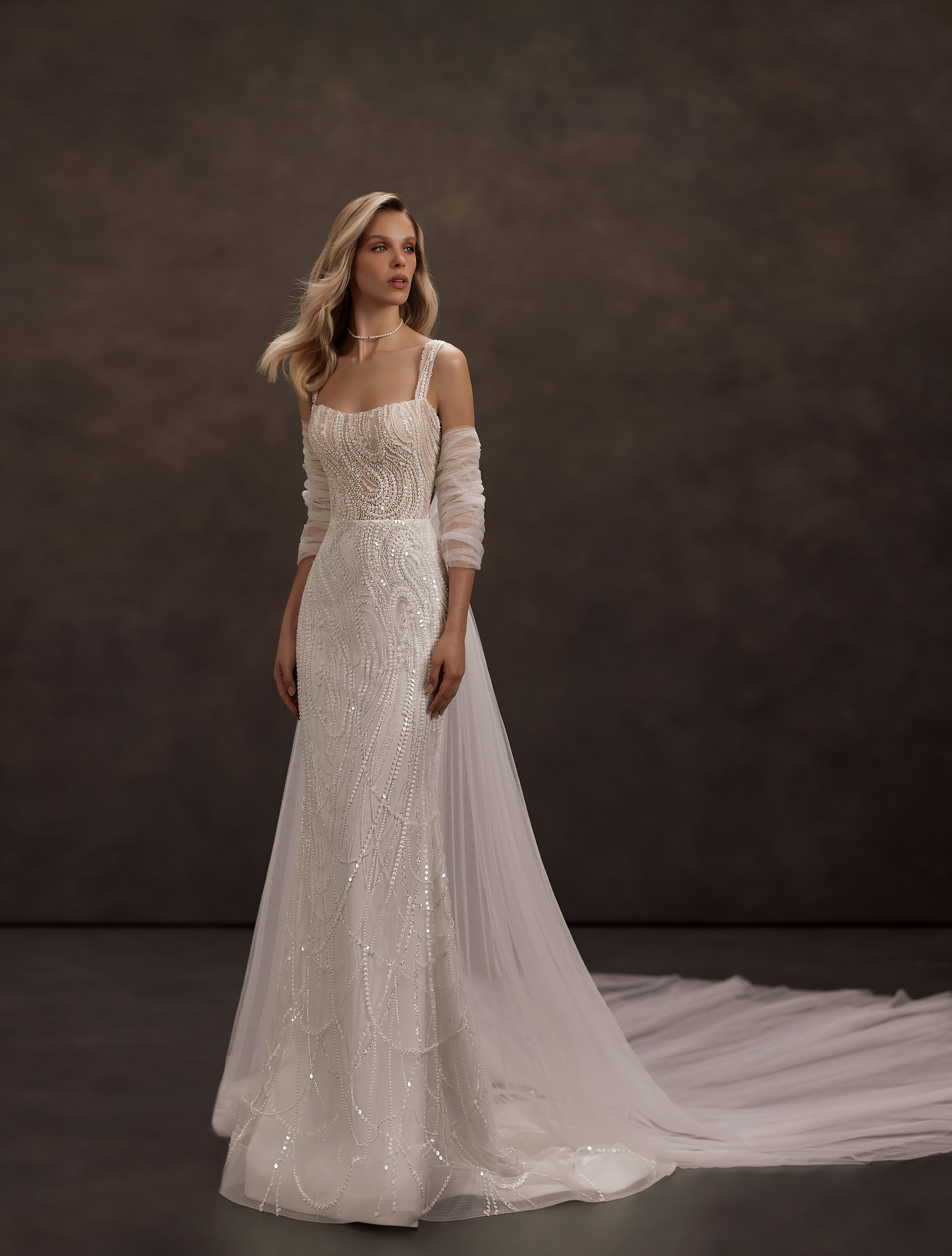 O rochie de mireasă splendidă în siluetă „sirena”, care îmbină lejeritatea, feminitatea și luxul rafinat. Corsajul și fusta sunt realizate dintr-un material sclipitor cu paiete, decorat cu mărgele, paiete și perle delicate, creând o strălucire unică la fiecare mișcare. O pelerină ușoară din tul conferă ținutei o grație aparte, iar fusta cu tren pare creată pentru protagonista unui film romantic — spectaculoasă, elegantă și de neuitat. Alegerea perfectă pentru cei care visează la confort și la o apariție impresionantă în cea mai importantă zi.