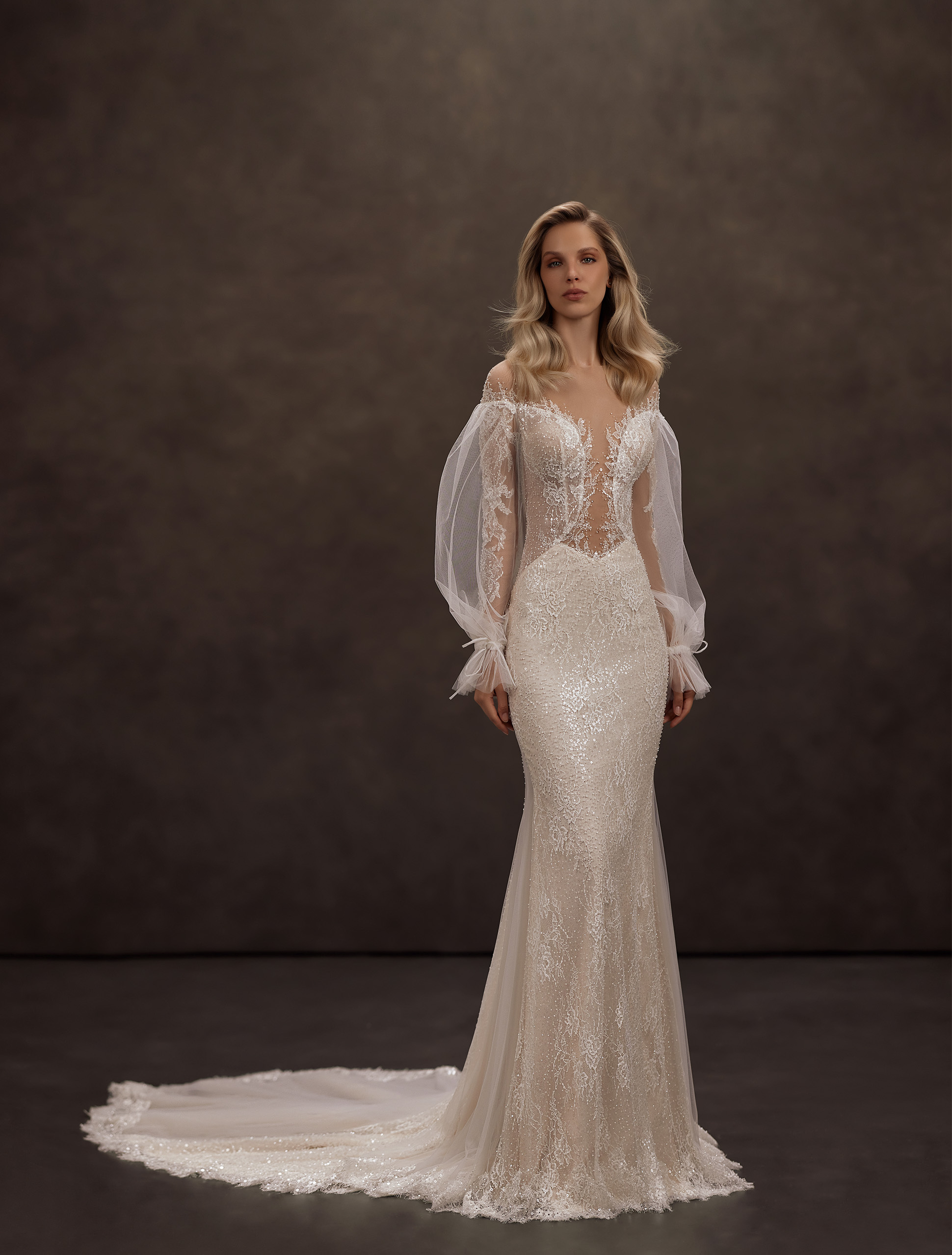 Această rochie de mireasă în siluetă „sirena” este întruchiparea luxului modern și a feminității rafinate. Corsajul romantic, realizat dintr-un material semitransparent și cu mâneci lungi, subliniază elegant linia taliei, alungind vizual silueta și creând un efect de eleganță sculpturală. Fusta cambrată din material strălucitor cu glitter trece lin într-un tren sofisticat, umplând ținuta cu o strălucire nobilă și grație. Inserția nude reprezintă un alt accent, evidențiind delicat frumusețea naturală, senzualitatea și feminitatea impecabilă a look-ului.