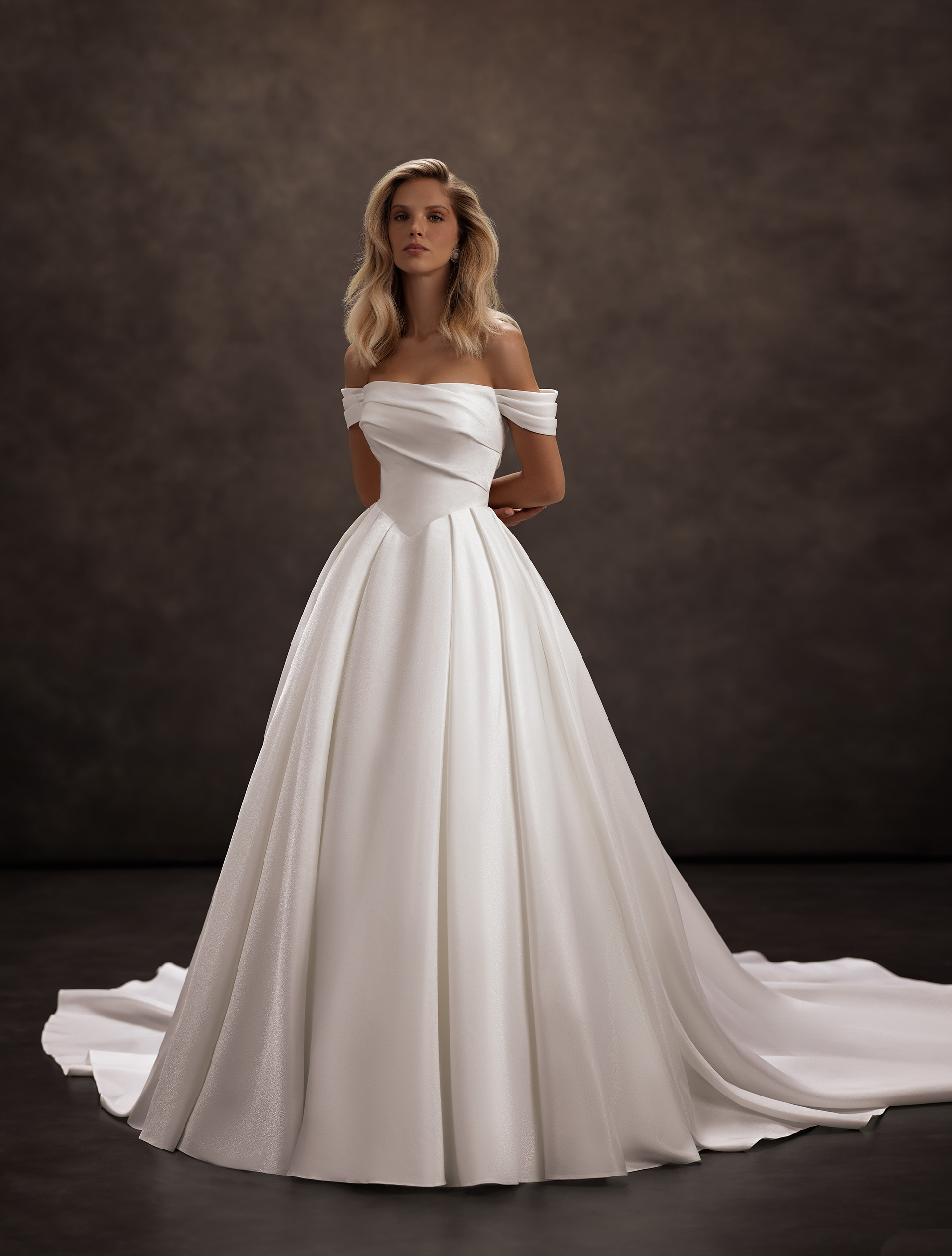O rochie clasică în croială A — armonia eleganței și a clasicului delicat. În centrul atenției se află strălucirea satinului și forma rafinată a corsajului, cu un accent în formă de V pe talie, care evidențiază liniile feminine, iar umerii elegant dezgoliți adaugă lejeritate și grație.