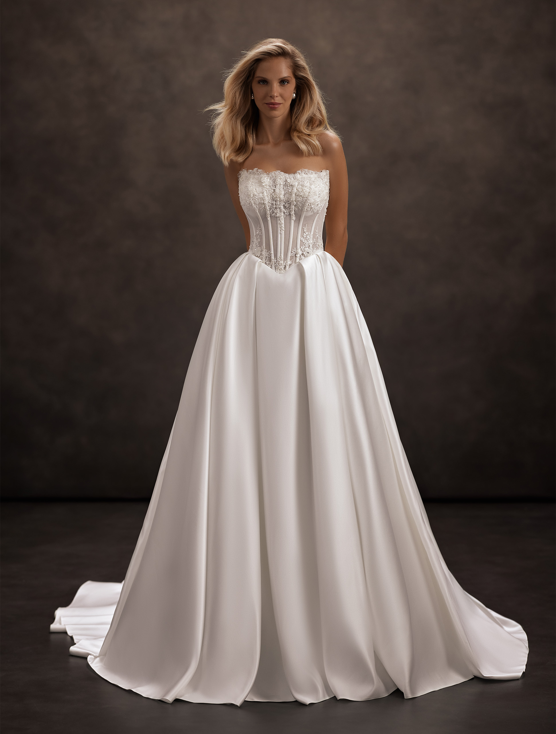 O rochie în siluetă A se potrivește perfect și adaugă un farmec deosebit look-ului tău de mireasă. Corsajul fără bretele, semitransparent, este decorat cu dantelă brodată cu mărgele și paiete, combinând delicatețea cu rafinamentul. Partea de jos a corsajului în formă de V evidențiază subtil talia, creând o siluetă feminină. Fusta din satin completează ținuta cu eleganță și lejeritate, făcând-o cu adevărat de neuitat.