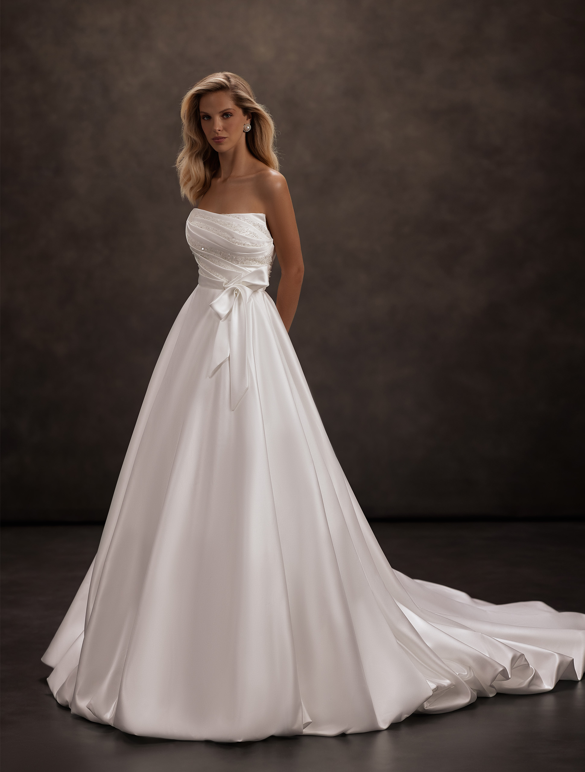 O rochie din satin în siluetă A impresionează printr-un accent rafinat pe corsajul drapat magnific, care îmbrățișează delicat silueta, creând armonie și eleganță. Talie este evidențiată cu un fund din satin, care adaugă ținutei rafinament și feminitate subtilă. Silueta fluidă A a fustei curge lin, oferind lejeritate și grație fiecărui pas. Această rochie creează imaginea unei adevărate doamne — elegantă, grațioasă și atemporală, perfectă pentru o zi de nuntă de neuitat.
