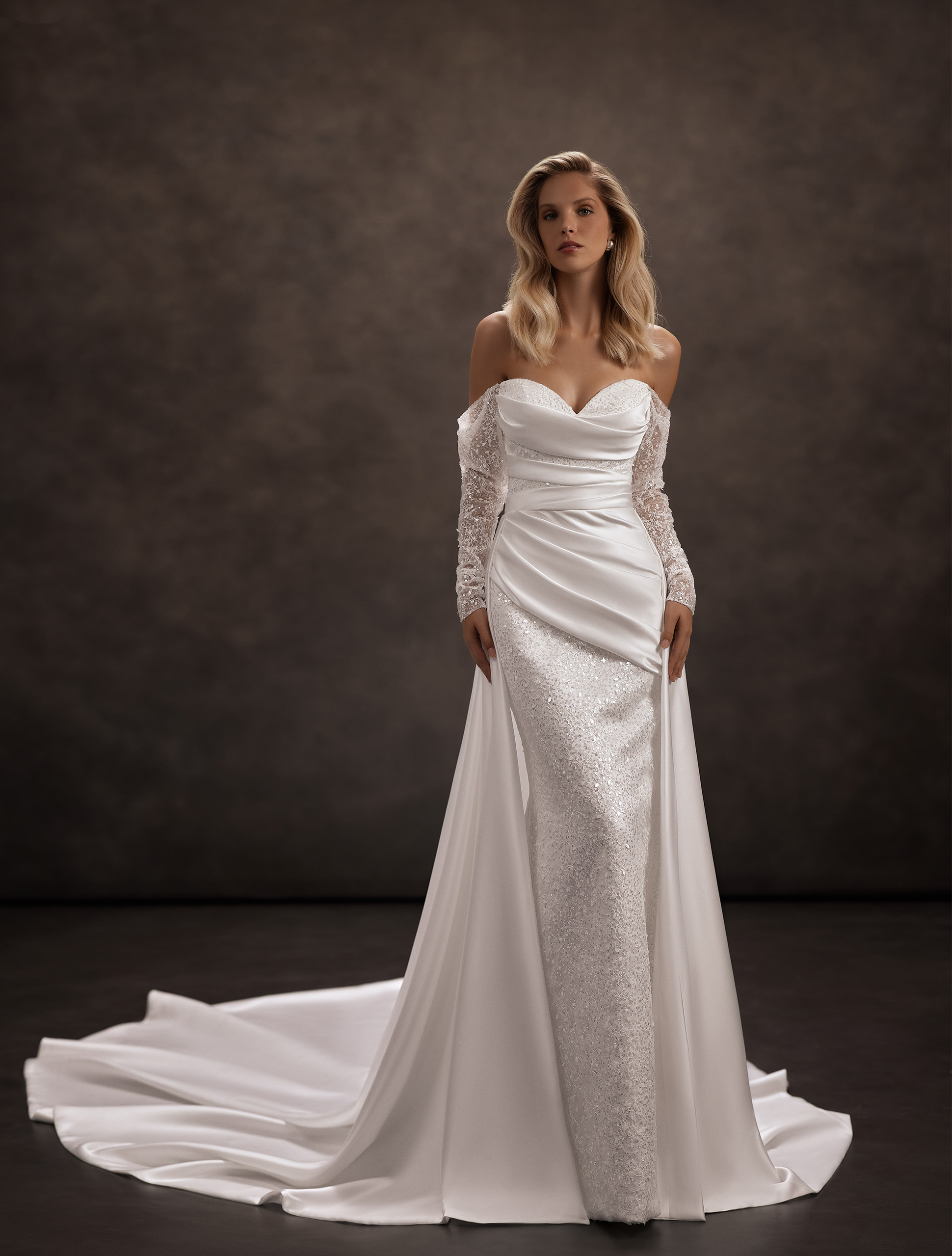 O rochie în siluetă „sirena”, care combină armonios strălucirea glitter-ului cu rafinamentul satinului. Corsajul este decorat cu un drapaj delicat, iar umerii goi conferă ținutei finețe și romantism, evidențiind farmecul feminin. Rochia se mulează elegant pe siluetă, creând un echilibru perfect între eleganță și lejeritate. Această ținută minunată formează un look de mireasă visător, rafinat și delicat, lăsând o impresie de neuitat în ziua ta specială.
