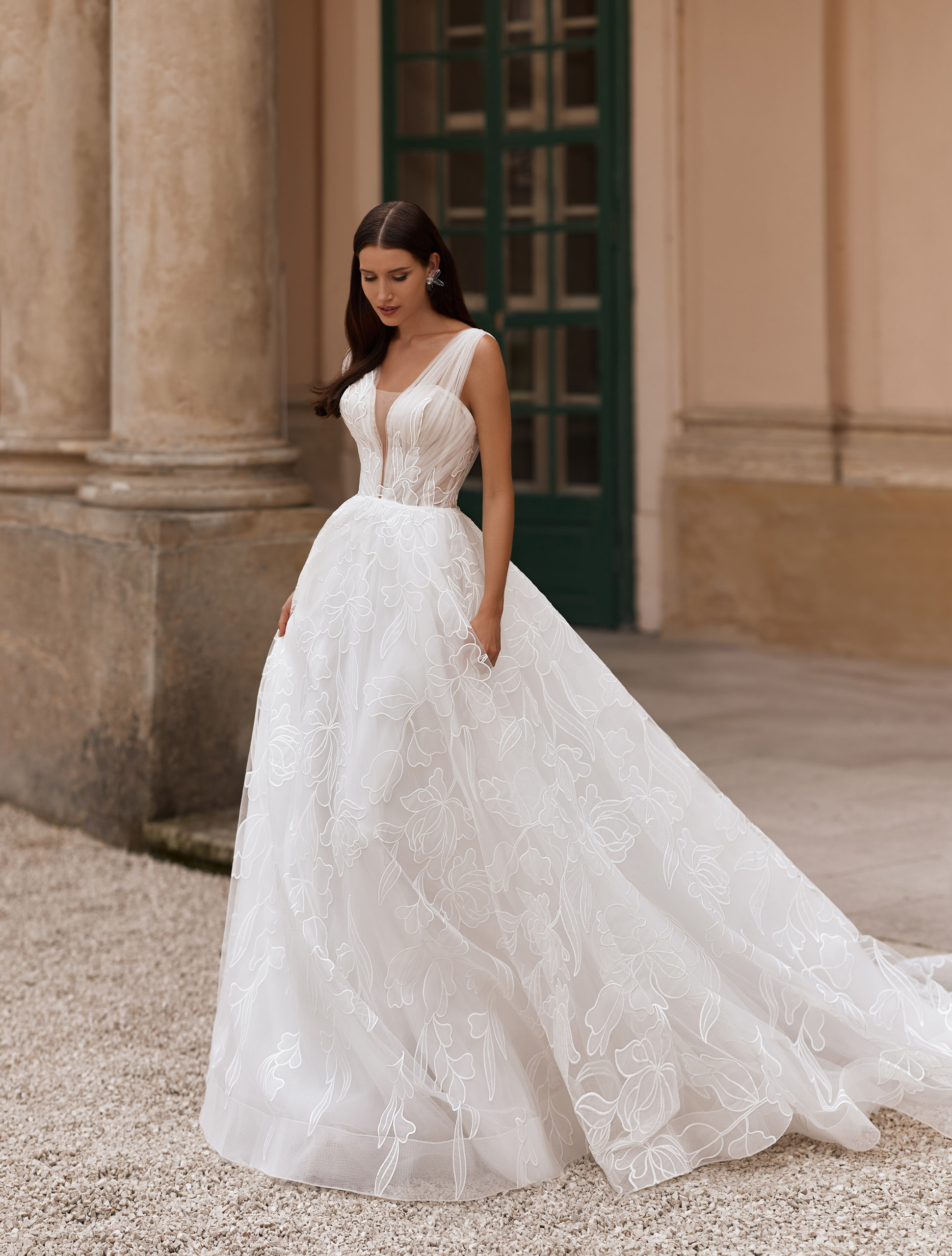Легкое и изысканное платье А-силуэта покоряет своим утонченным силуэтом и великолепным узором. Элегантная драпировка на лифе гармонично сочетается с воздушной романтичностью, создавая образ утонченной героини кинороманов. Нюдовая вставка акцентирует внимание на изящном декольте, добавляя нотку чувственности и изысканности. Юбка со струящимся шлейфом дарит ощущение легкости и свободы, позволяя вам почувствовать себя истинной леди. Это платье — воплощение утонченной элегантности и мечтательной романтики, созданное чтобы блистать в своем самом волшебном моменте.